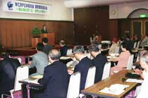 1日目は、平内町の松緑神道大和山(田澤豊弘教主)本部でシンポジウムが開かれ、会場には同教団信者、本会青森教会会員19人ら合わせて約200人が参集しました。「森は海を育てる~自然の共生システム」をテーマに千代和芳・大和山山林事業部長が講演しました。