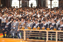約6000人が参加した「一乗行進」。心を一つに、それぞれが行進の中で被災地に祈りを捧げた。写真は、本部班隊長の泉田和市郎青年本部長に続いて登場した釜石教会 平成23年次「お会式・一乗まつり」が10月2日、立正佼成会本部周…